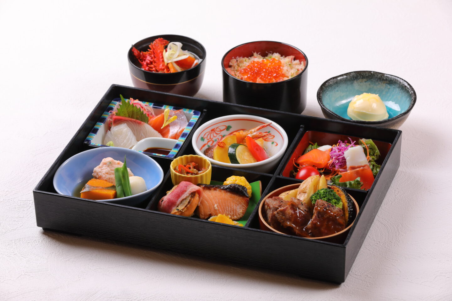 旬の御造り 3種盛り合わせ/シーフードサラダ/旬の炊き合わせ/コーン摘まみ揚げ/北海道旬の焼き魚/帆立のベーコン巻/大海老の甘辛炒め黒糖風味/旬の道産惣菜の小鉢/牛カットステーキ 和風山わさびソース/三色御飯(鮭、蟹、いくら)/旬の味噌汁/香の物/北海道バニラアイスクリーム