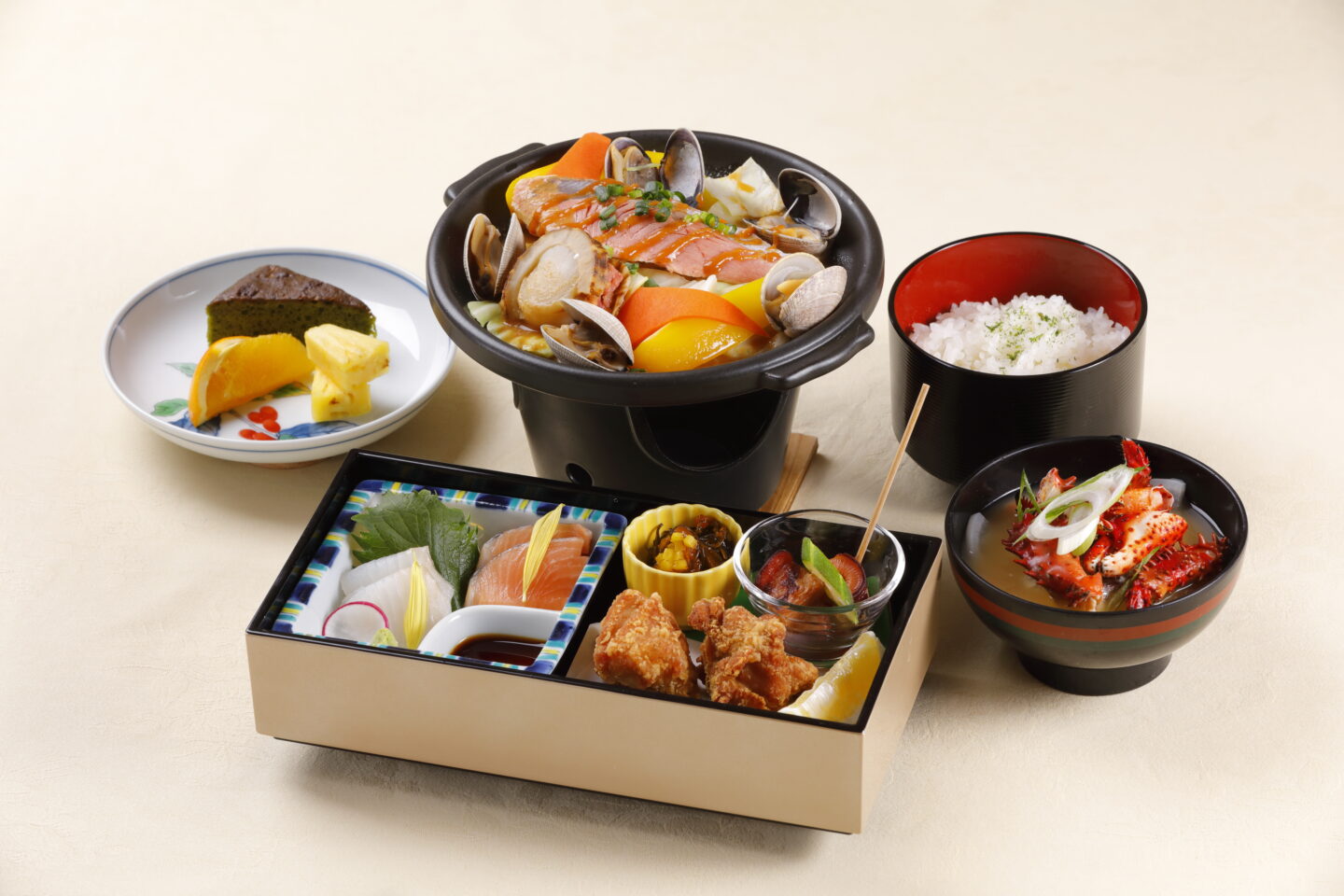 オードブル重(旬のお造り2種・塩ザンギ・小鉢2種)/北海陶板ちゃんちゃん焼き/御食事/根室花咲蟹の鉄砲汁/本日のデザート