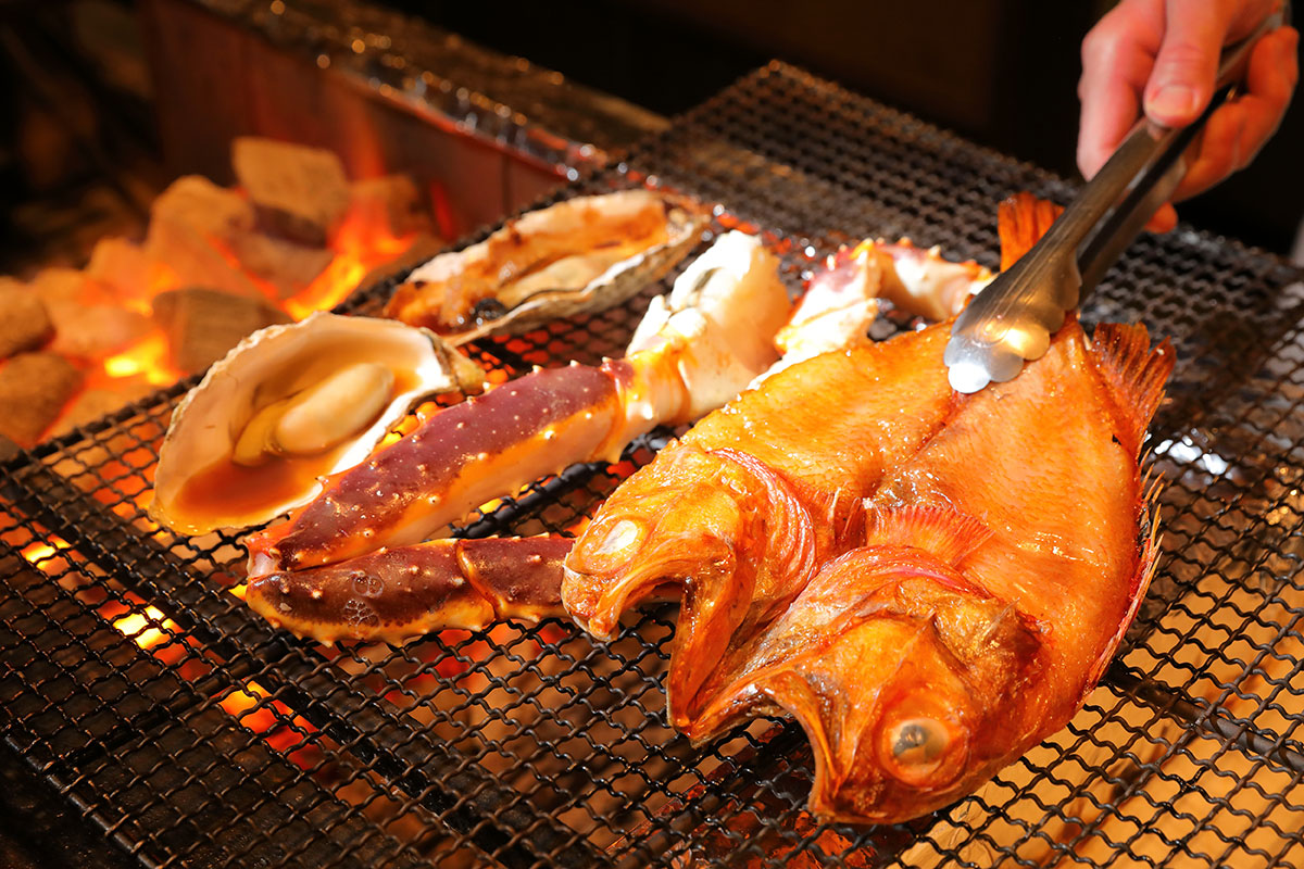 北海道の新鮮な山海の幸を、臨場感たっぷりの炉端焼きスタイルで。