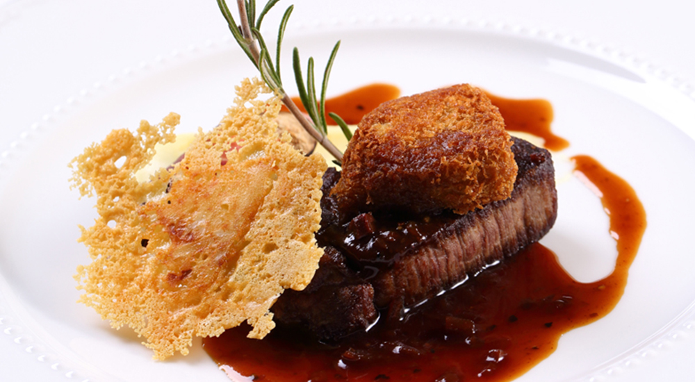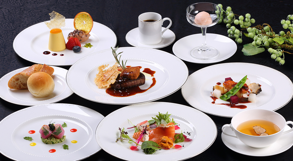 《アミューズ》帆立貝のタルタル奉書仕立て キャビア飾り/《前菜》鯛とサーモンの紅白仕立て 季節の野菜と雲丹を添えて/《スープ》トリュフ入りコンソメスープ ロワイヤル仕立て/《魚料理》キンキのポワレ 鮑添え 香草バターソース/《お口直し》ピンクグレープフルーツシャーベット/《肉料理》国産牛フィレ肉 ポワレトリュフ風味のデュクセルクロケット 赤ワインソース/《お食事》道産小麦を使用したパン2種/《デザート》セレブレイトデザート 2人のお祝いを込めて/《ドリンク》コーヒー or 紅茶